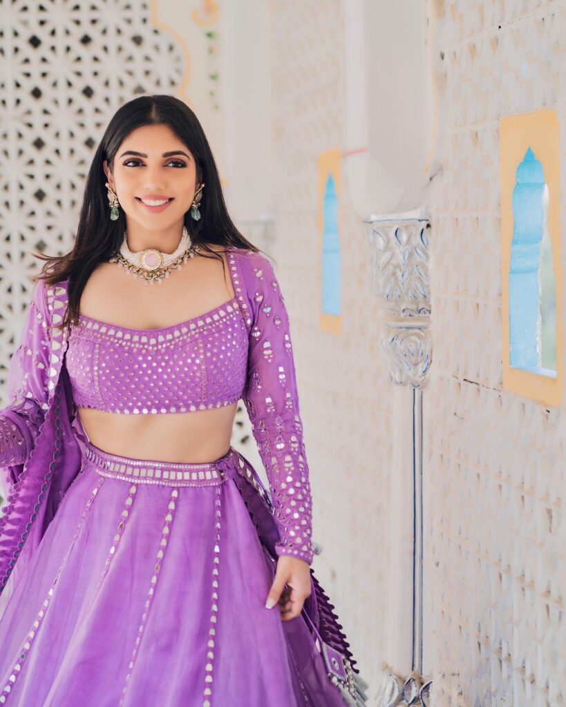 Samiksha Pednekar spotted wearing the ‘Catnip purple lehenga set’ from Vvani by Vani Vats & the “Pink quartz choker set” from Joolry by Karishma for a wedding event.