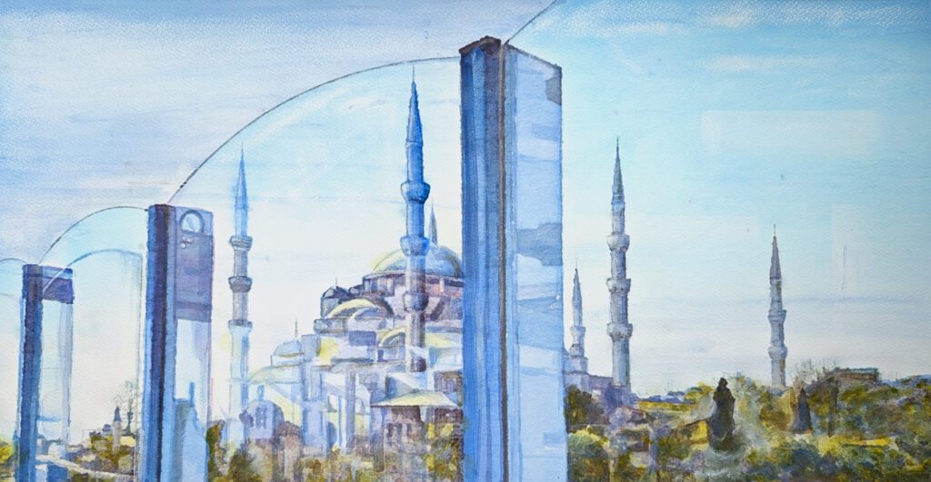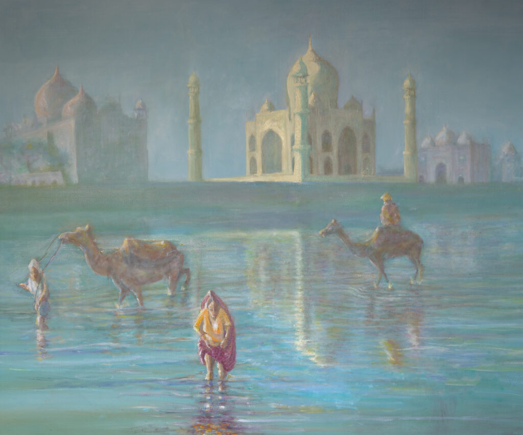 The collection spans a range of ‘scapes’—landscapes, cityscapes, and even waste scapes. His works depict iconic locations such as the Taj Mahal, St. Paul’s Cathedral, the canals of Venice, and Richmond Bridge, but beyond their beauty, they tell layered stories. The Taj Mahal, for instance, symbolizes eternal love, yet its painting also alludes to environmental decay and pollution. His depiction of Venice highlights both its romantic charm and its slow submersion due to climate change. Each piece encourages viewers to look beyond the surface and engage with the evolving human imprint on these places.