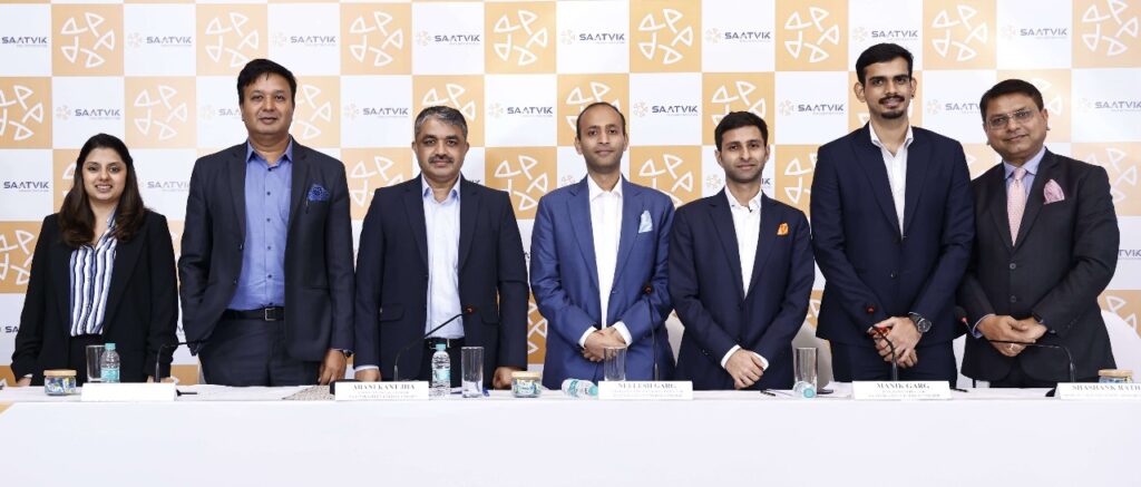 Saatvik 3 (L-R): Ms. Mrinali Doshi (DAM Capital Advisors Limited); the management of Saatvik Green Energy Limited – Mr. Prashant Mathur, CEO; Mr. Abani Kant Jha, CFO, Mr. Neelesh Garg, CMD; Mr. Manik Garg, MD; Mr. Shashank Rathi (Motilal Oswal Investment Advisors Limited); and Mr. Vikas Khattar (Ambit Private Limited.) at the press conference to announce Saatvik Green Energy’s forthcoming Initial Public Offering.
