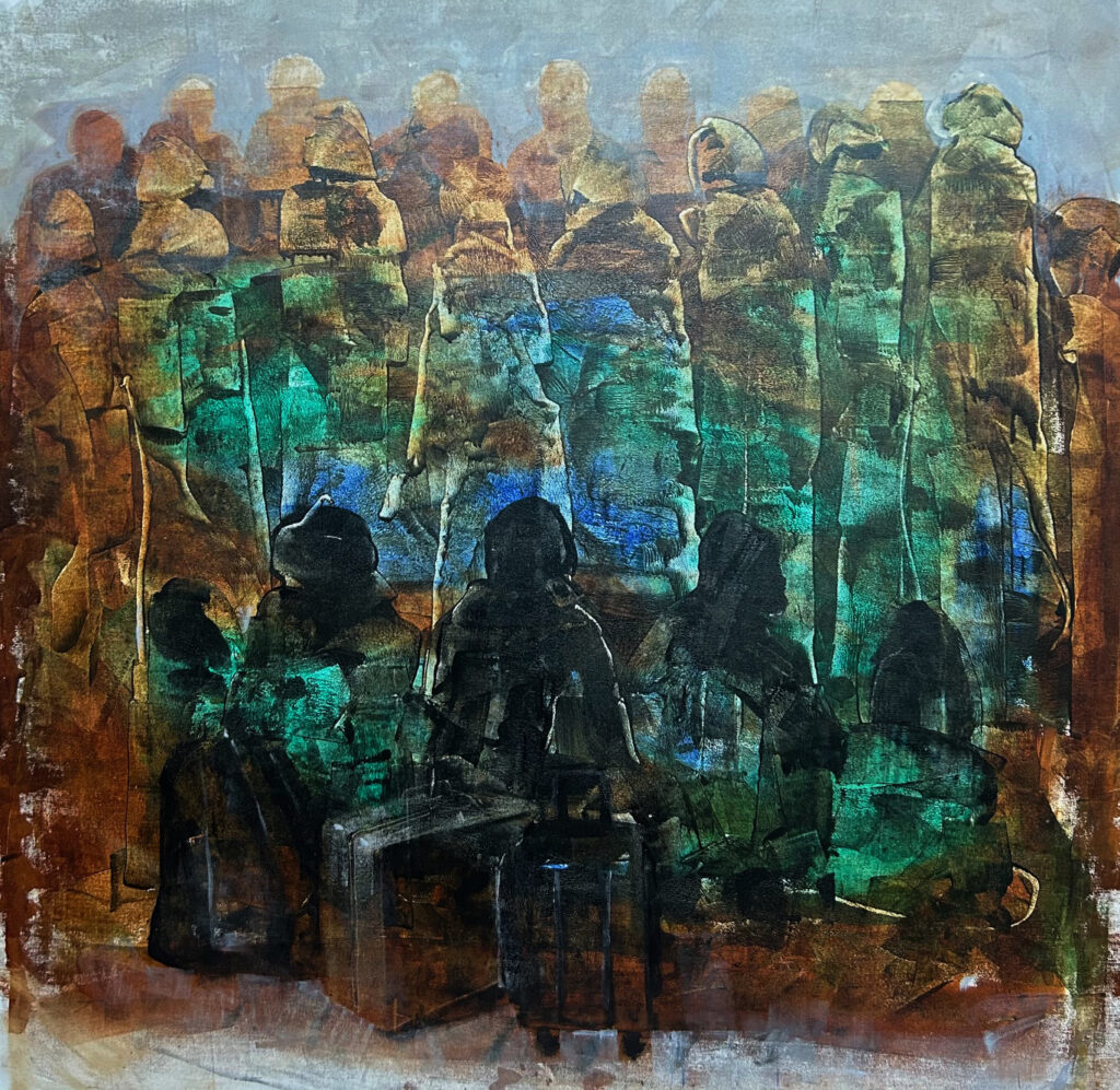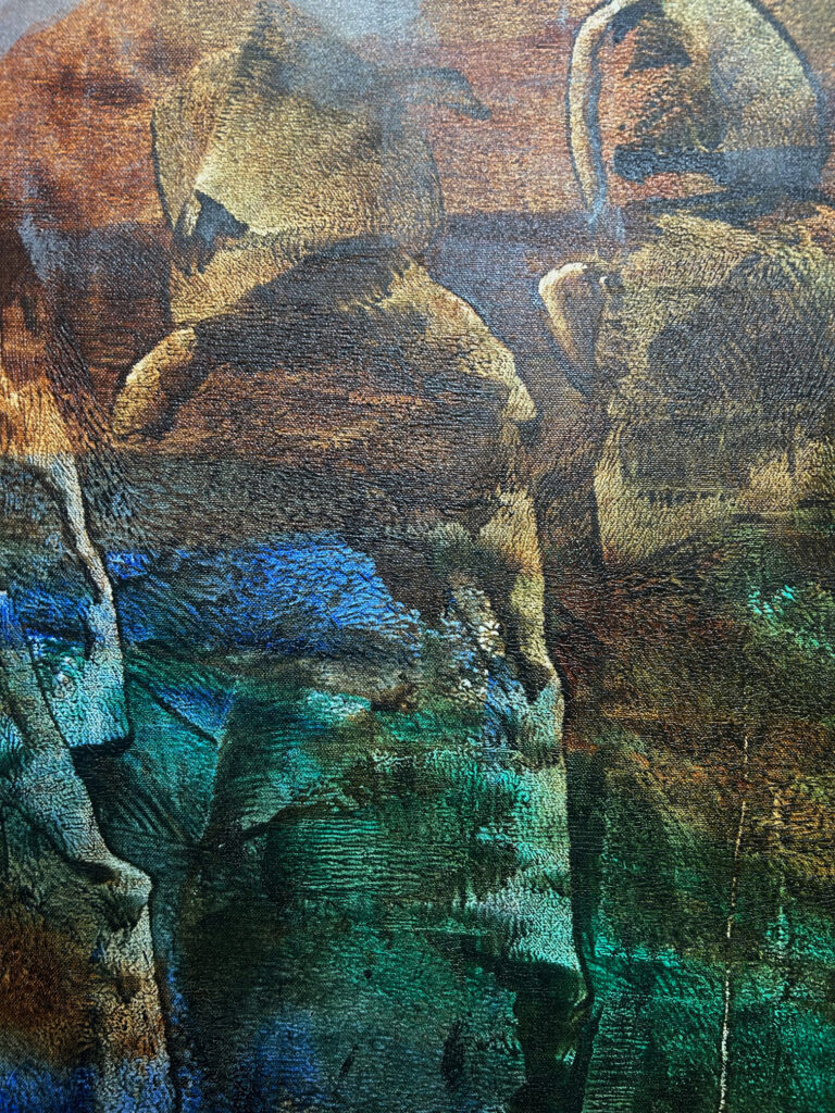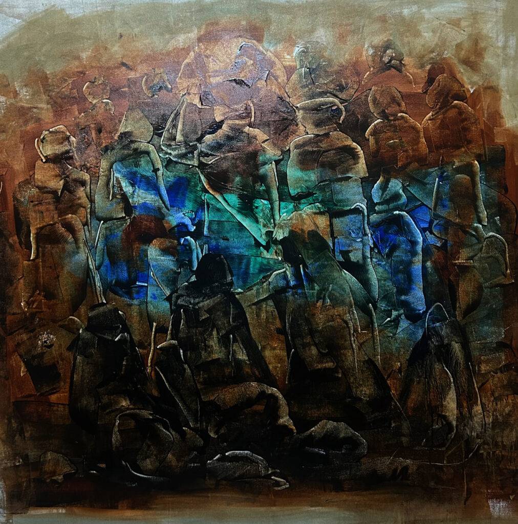 Vishwa Sahni’s painting seems to have been focused for some time on the contention that abstraction, if allowed to breathe in a deeper pictorial space, can maintain visual opulence without drifting too far from its essentially two-dimensional syntax. Among a generation of artists who matured on this side of painting’s pluralist expansion, where each painter’s style, look and touch was far more varied than that of their predecessors, Sahni held to a firm figurative scaffold based on migration both perceived and imagined. Though the iconography in this recent work remains readable each painting’s horizon is still easy to find, there is in newer panels a softening of the edges and a swelling of forms that now shimmer behind translucent washes instead of bending, as they once did, into each other’s space. From an optimal distance coerced from the viewer by the five feet by nine feet spread of their frames their reconfigured cohesion seems to rely less on drawing and more on a spontaneous manipulation of hue and texture.