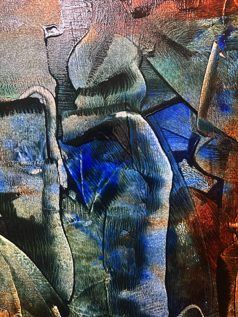 And yet to my eye the most adventurous of the newer canvases in the show, still owes something to the lexicon of the earlier work, though here it seems Sahni’s method has turned to a new and pronounced improvisation. Visthapan’s surface remains in a perturbed state. Edges are ragged and makeshift. Translucency dominates. There is even a gestural coarseness replacing what was once a controlled chaos of endlessly suggestive shapes. The color alone in Visthapan provides the link to earlier work, being mostly middle tones of contingent primary and secondary hues.