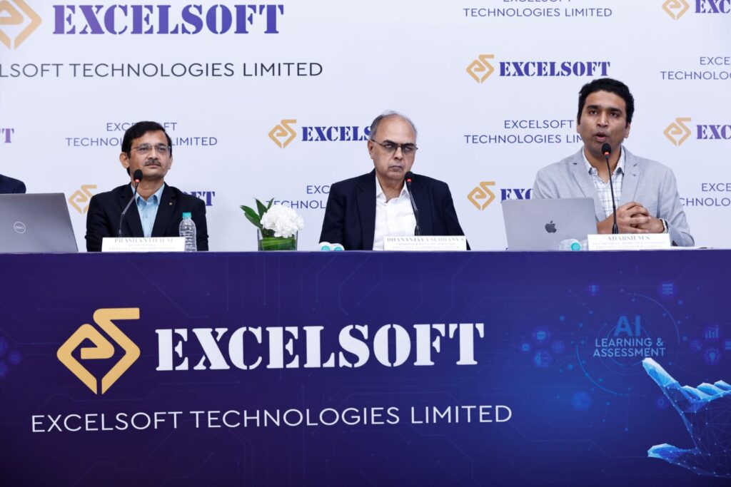 Excelsoft 3: (L-R) Prashanth H M, Head Strategy, Excelsoft Technologies Limited; Dhananjaya Sudhanva, Chairman & Managing Director, Excelsoft Technologies Limited and Adarsh M S, Vice President – Products & Innovation, Excelsoft Technologies Limited at a press conference in connection with the company’s forthcoming Initial Public Offering (IPO).