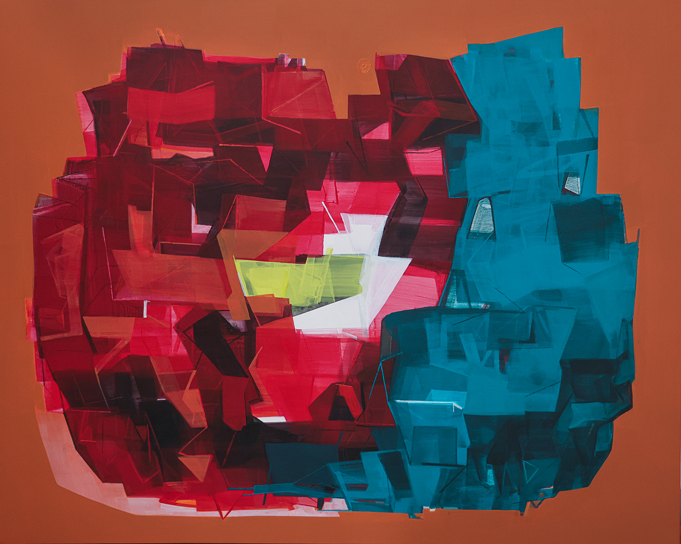 Although his works appear abstract, they are anchored in the rhythms of the visible world, its pauses, frictions, and reverberations. His surfaces carry a sense of return and response: every encounter, whether with nature, society, or the ordinary mechanics of daily existence, rebounds into the pictorial field. This cyclical exchange lends his compositions a quiet intensity, where colour blocks, fractured planes, and layered textures behave like echoes of perception rather than representations of objects.