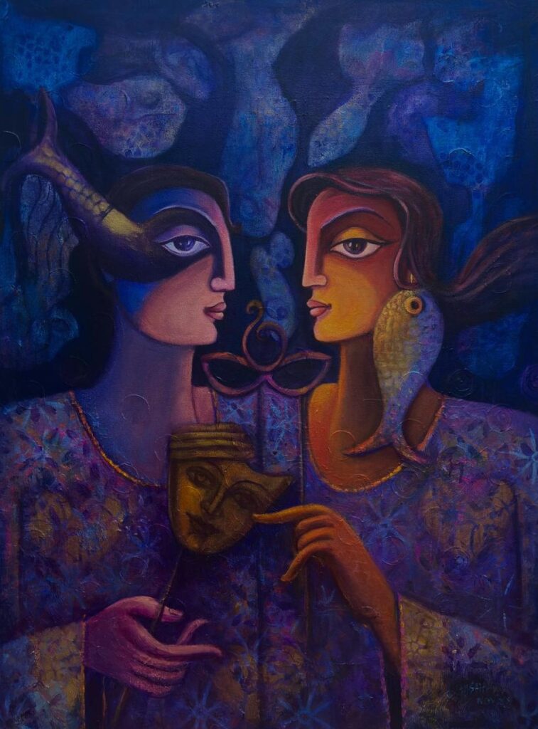 Shetty’s practice is grounded in rigorous training in drawing and painting, supported by formal study of Indian aesthetics. Her works do not follow narrative structures; instead, they invite slow looking and quiet engagement. Figures appear as inward-facing presences rather than portraits, existing as states of being. These are placed in dialogue with abstract structures, subtle geometric rhythms, and elements drawn from nature and ritual.